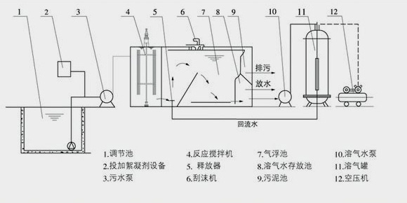 加压溶气气浮在国内外应用广泛,该法师将原水加压至0.3~0.4MPA,同时通入空气,使空气溶解与水中并达到相应压力状态下的饱和值,然后骤然减至常压,溶解于水中的空气以微小气泡的形式从水中释放出来,气泡直径约为Ø20~Ø100μm左右,目前的基本流程有全部进水加压溶气气浮、部分进水加压溶气气浮、部分处理水回流加压溶气气浮等三种,都是由加压泵、溶气罐、释放器和气浮池等基本设备组成。