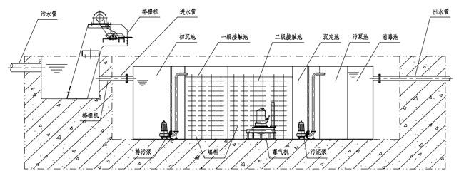 设备主要有七部份组成:(1)全自动格栅(2)缺氧池(3)生物接触氧化池(4)二沉池(5)消毒池(6)