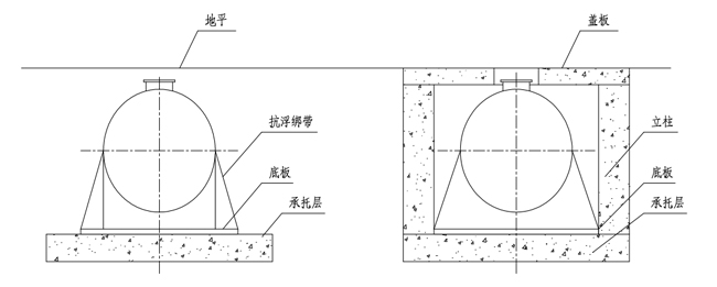 如设备埋设在地坪以下,基础标高必须小于或等于设备标高并保证下雨不积水,基础一般是素混凝土(是否配筋视当地地质情况而定)。为提防设备上浮,基础应预埋抗浮环。(详见设备安装图)