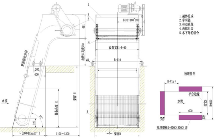 FHG 反捞格栅有传动系统、机架、耙齿、牵引链条、水下导向轮、附栅、主栅、挡渣板等组成。传动系统通过牵引链条带动耙齿杆沿着导轨做上下回转运动,齿耙从栅条的后部下行,在底部经水下导向轮改向后运行至栅条前部,由下向上地将栅条拦住的漂浮物顺着挡板捞至卸渣口处,卸入输送带上或垃圾车里。