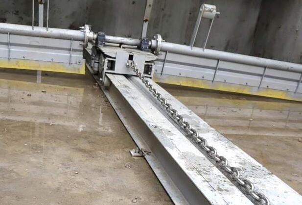 单轨式水下刮泥机由含牵引索链、刮泥台车机构、索链轮及索链轮架台、池底轨道及固定装置、驱动装置、保护装置、索链张紧装置、正逆转控制组件及就地控制柜等全套设备构成,所有构件须能在设计的工作环境顺利操作。